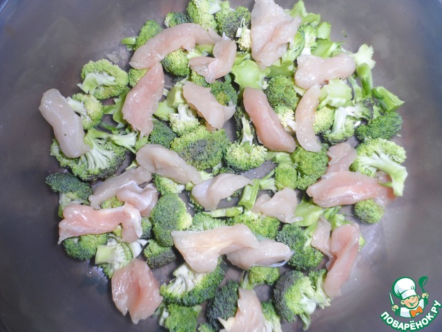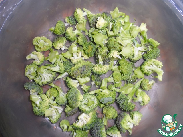 На дно чаши пароварки выкладываем половину соцветий брокколи.