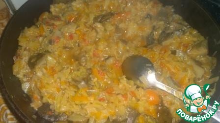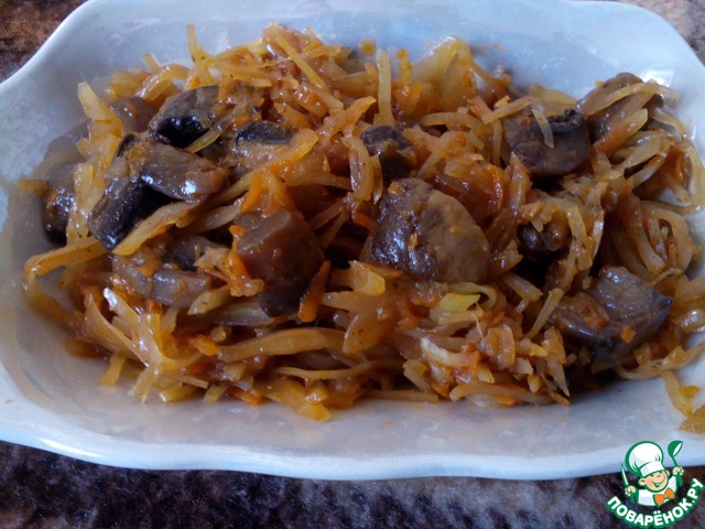 И сегодня я решила попробовать приготовить этот салат в мультиварке-скороварке объемом на 5 литров (мощность 900 Ватт). В нее я беру такие пропорции: капуста 1 кг, лук 200 г, морковь 200 г, болгарский перец 2 шт., томатный соус 100 мл, соль 25 г, сахар 40 г, подсолнечное масло 100 мл, лаврушка 2 шт., вода 5 ст. л., грибы 600 мл, уксусная эссенция 1/3 ч. л.