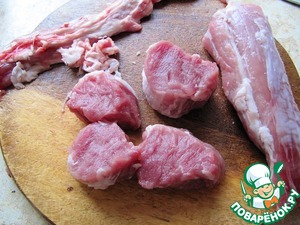 Для приготовления использую филе свинины. Обрезаю от жилок, нарезаю кусочками толщиной 2-3 см, смазываю растительным маслом, солю, посыпаю смесью перцев.