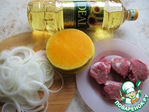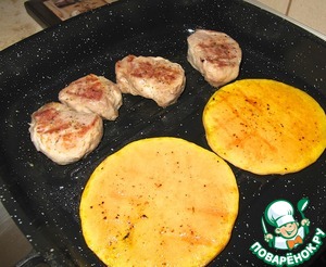 На сухую разогретую сковородку-гриль выкладываю кусочки мяса и диски тыквы, обжариваю с двух сторон. Мясо не пересушить - снять с огня со средней степенью прожарки, переложить на горячую тарелку и накрыть фольгой, чтобы мясо "созрело" на 10-15 минут. Тыкву переложить на тарелку.