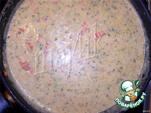 В мисочке или большой кружке смешать сливки с водой, всыпать соль, перец, разные специи и немного муки. Хорошо перемешать и залить этим то, что на сковородке