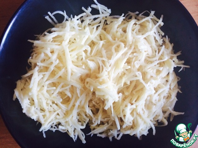 Очищенный картофель натереть на мелкой терке (я это делаю в блендере при помощи спец. насадки). Немного посолить и дать постоять пару минут, чтобы картофель дал сок. Данный сок отжать.