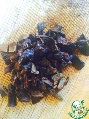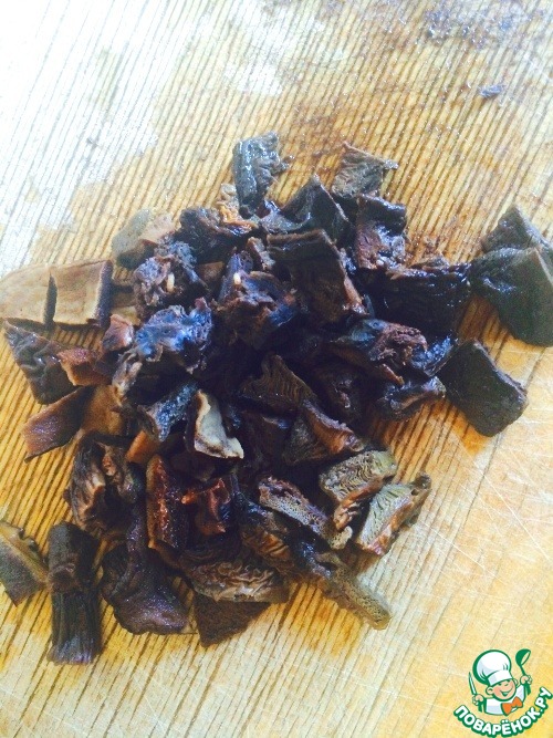Грибы меленько порезать. Можно любые грибы взять, но с белыми, конечно, ароматней и вкуснее