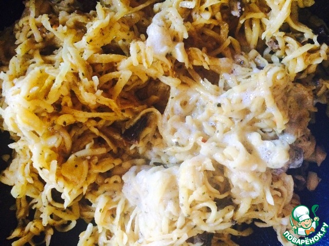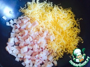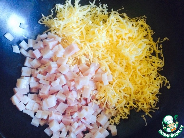 Полученной смесью заливаем ветчину и сыр, размешиваем. -