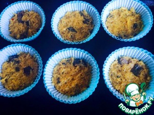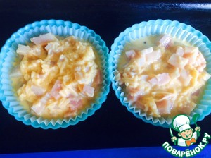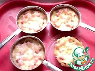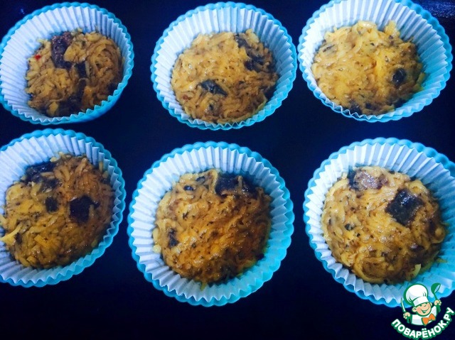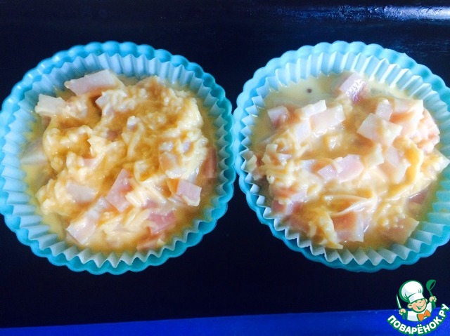 Спустя 30-40 минут достаем из духовки наши формочки, ложкой наливаем в картофельные кексики нашу заливку и снова отправляем в духовку минут на 10-15. За это время кексы-драники поднимутся за счет яйца, а картофель успеет пропитаться заливкой!