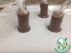 Когда шоколад застынет, вынуть пробку аккуратно с помощью штопора и затем, протянув за края, освободить стаканчики от пищевой пленки. Для того, чтобы разровнять края стаканчиков, разогрейте нож в горячей воде и проведите по краям
