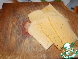 Пока жарятся драники.. Берем кусочки хлеба и выкладываем на них сыр.. Затем как драники с одной стороны обжарились снимаем их со сковороды и кладем обжаренной стороной на сыр.