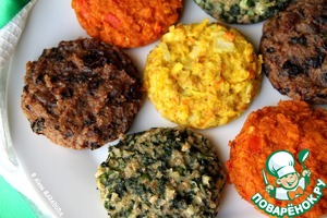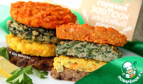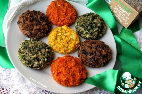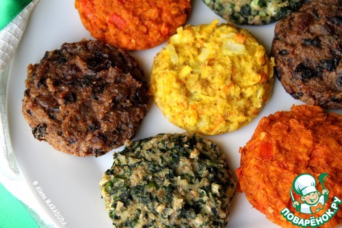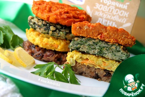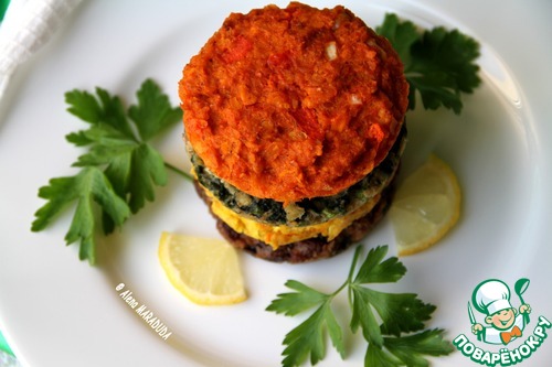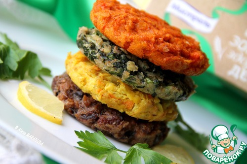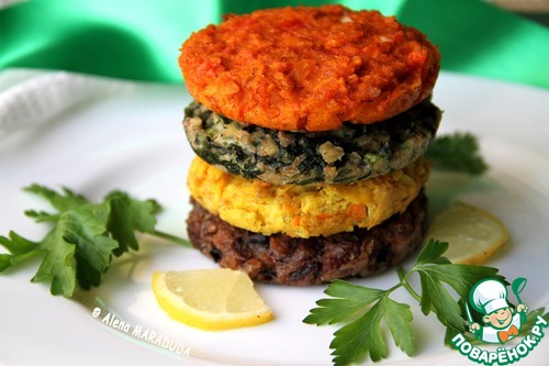 Готовые и теплые "шайбочки" укладываем в последовательности: "Коричневый", "Желтый", "Зеленый", "Красно- оранжевый". Украшаем веточками свежей петрушки и дольками лимона. Подаем в теплом виде. Можно также полить сверху одной столовой ложкой льняного масла холодного отжима.