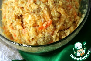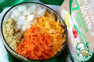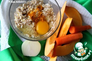 "Желтый" слой: добавляем в злаки яйцо, натертые на терке тыкву и морковь, нарезанный репчатый лук.