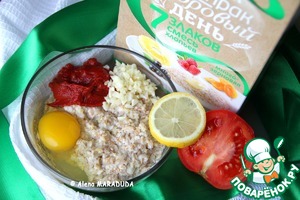 Измельчаем половинку небольшого помидора, чеснок (чистим, раздавливаем широкой частью ножа и измельчаем), измельчаем дольку лимона. Добавляем томатную пасту. Все тщательно перемешиваем до густой однородной массы.