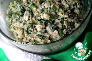 "Зеленый" слой: добавляем в злаки яйцо, шпинат (если шпинат замороженный- размораживаем предварительно, если свежий- мелко измельчаем), зеленый лук, морскую соль.