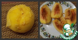Персики вымыть, сделать крестообразный надрез. Обдать кипятком и снять кожу. Разрезать на 4 части и удалить семечку.