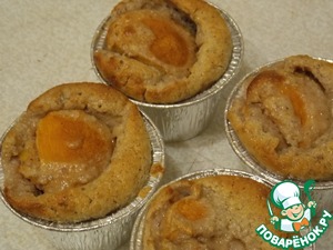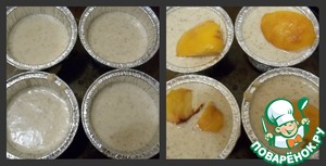 Формочки заполнить массой на половину и вложить в серединку четвертинки персиков. Если формочки большие, то можно и по половинке фрукта.