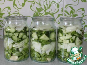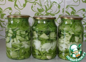 А можно закатать и по другому:заполнить банки овощами, добавить масло, залить маринадом и стерилизуем 20 минут.