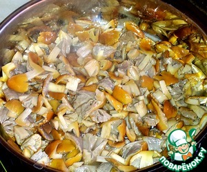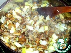 Слить с них воду и переложить в сковороду. Обжаривать пока не испарится вода. Налить масло. Нарезать лук и положить в грибы.