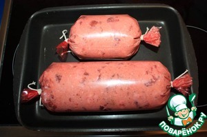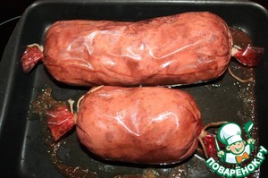 Набить фаршем череву или искусственную оболочку. У меня пластиковая оболочка диаметром 7.5 см. При помощи иголки удалить пузырьки воздуха.