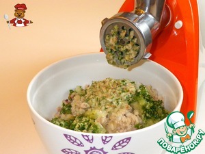 3. Установите крупную решётку в мясорубку и приготовьте фарш из кусочков сибаса, петрушки, лука и пшеничного хлеба.