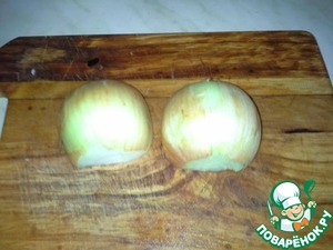 Луковицу очистить и разрезать на 2 части. Всю шелуху снимать не надо, так как она придает прекрасный золотистый цвет бульону.