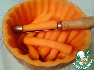 Очистив тыкву от семечек, вынимаем мякоть. Лучше всего это делать при помощи ножа для удаления яблочных косточек. Мякоть удаляем таким образом, чтобы на краях оставалось по 5-6мм.