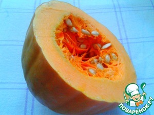Тыкву режем пополам. У меня была на 2кг, поэтому в рецептуре указан вес 1кг. Исходя из этого были отмеренны остальные ингредиенты, т. е. для килограммовой тыквы. Если у вас маленький овощ, то срежьте только верхнюю часть, как бы крышечку.