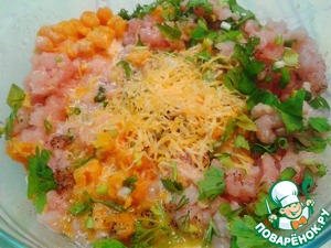 • Смешиваем фарш+ припущенные кусочки тыквы+ яйцо+ нарезанную зелень.