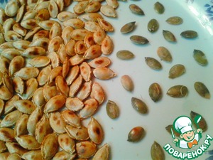 Семечки можно не выбрасывать (по желанию). Семечки промываем, просушиваем и обжариваем на среднем огне с двух сторон. Если вы хорошо прожарите, то они будут прекрасно чиститься. Если пережарите, то ядрышко будет рассыпаться, но целебных и полезных свойств не потеряет.