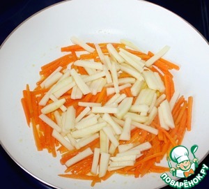 • Затем добавить свеклу, яблоко и персик, слегка обжарить.