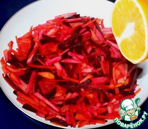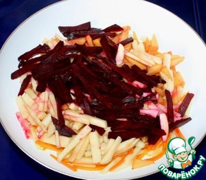 • Свеклу завернуть в фольгу, запечь в духовке, охладить и очистить. Яблоко и кабачок очистить от кожуры и семян, с персика удалить косточку. Овощи и фрукты нарезать соломкой.
