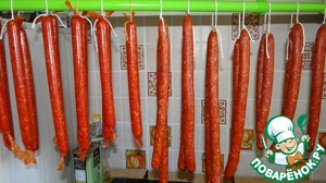 Если нет коптильни, то достаточно разложить колбасу на решетку духового шкафа (или развесить) и соблюдать тот же температурный режим;