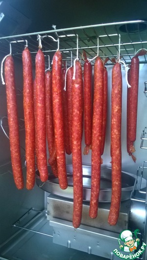 В одну из колбас воткнуть температурный датчик, развесить колбасы в коптильной камере, так, чтобы они не касались друг друга;