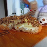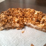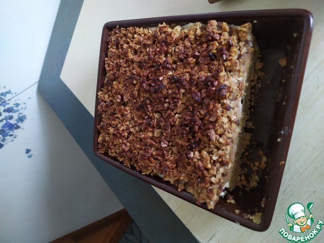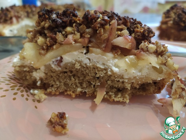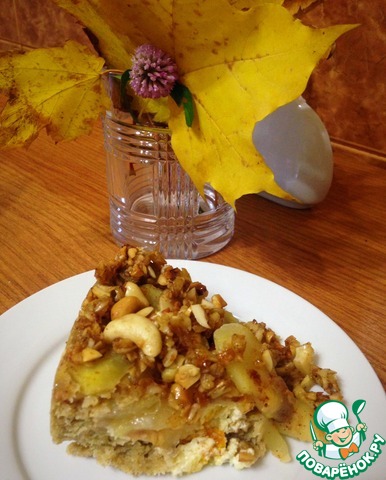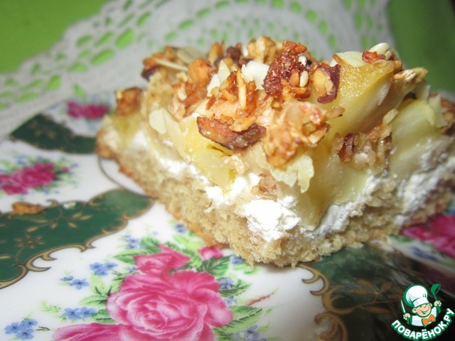 Обратите внимание! Я брала форму диаметром 20 см! Лучше всего брать разъемную форму, но так как у меня такой нет, я застелила свою форму фольгой, чтобы готовый пирог легче доставался. Смазать форму растительным маслом и посыпать овсяными хлопьями. Выложить тесто, затем творожную массу. Сверху накрыть яблоками. Последним слоем идет гранола.