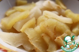 Для яблочного слоя: Яблоки помыть, почистить, удалить сердцевину, нарезать не очень тонкими ломтиками (толщиной где-то 0,5 см). К яблокам добавить сок половины лимона и белое вино, поставить огонь и готовить до мягкости яблок. Очень важно их не переварить!!! Для ленивых предлагаю более простой способ: яблоки почистить, удалить семечки и поставить в микроволновку на 5 минут. Получается нужное нам состояние яблок, и не надо ни за чем следить.