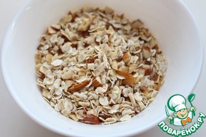 Сделать гранолу: Для этого смешать измельченные орехи (не надо измельчать в муку) и овсяные хлопья.