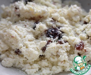 Для творожного слоя: Творог растереть вилкой, смешать с сахарной пудрой и изюмом.