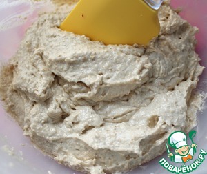 Взбить растопленное сливочное масло с обычным и ванильным сахаром и добавить яйца. Затем постепенно, непрерывно помешивая, ввести мучную смесь. Получится достаточно густое тесто.