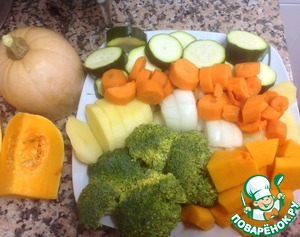 В одной кастрюле сварим: кабачок, брокколи, 2 морковки, 1 луковица, 1 картофель с одним стаканом воды. Закинуть овощи в кипящую воду и варить не более 15 минут.