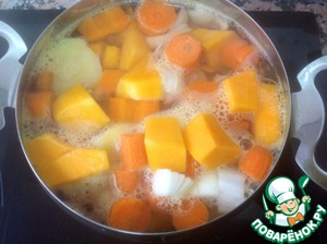 В другой кастрюле варим: тыкву,2 морковки, 1 картофель и 1 луковицу.