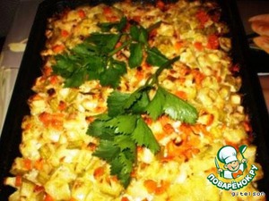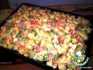 • После образования корочки, накрыть противень фольгой, чтобы сверху овощи не пригорели. Готовить до полного испарения сока (образующегося в процессе приготовления от овощей и мяса). Ну вот, все и готово. Блюдо получилось нежным, сочным и очень вкусным!