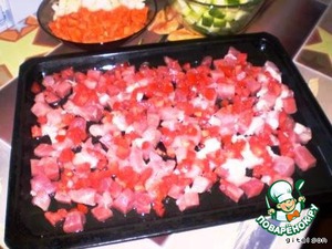 Противень слегка смазываем подсолнечным маслом, выкладываем мясо, распределяя равномерно по всей поверхности. Сверху помидоры. Посолить (по желанию можно добавить специи для мяса. Я только поперчила).