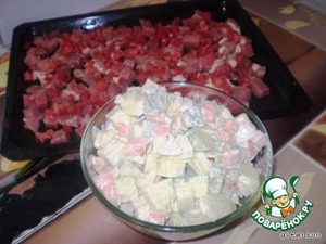• Очищаем овощи. Нарезаем все ингредиенты модными в сезоне 2008 года КУБИКАМИ!