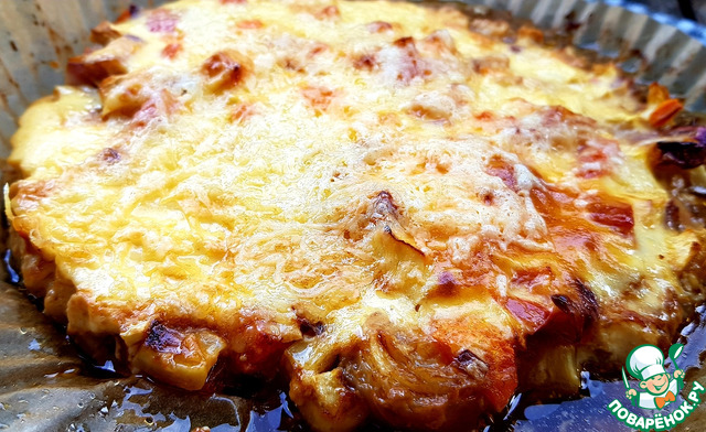 Закрываем этой смесью наши: мяско с помидорчиками. И - в горячую духовку!