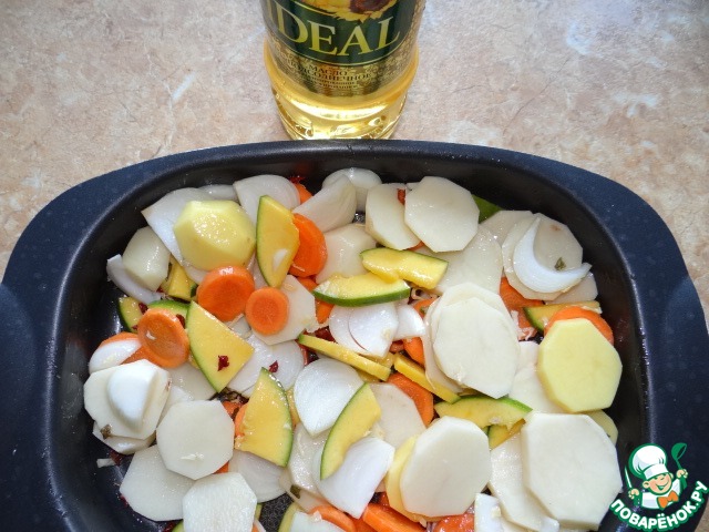 Овощи и манго порезать кругами (полукругами), подсолить по вкусу, добавить сушеных специй, масло и размешать;