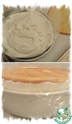 Коржи полностью остудить. Один корж положить на дно формы. Я выстелила форму пищевой плёнкой. Если у вас форма разъёмная, то выстилать не надо.