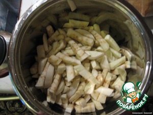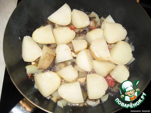 • Картофель режим на 4 части и выкладываем сверху на овощи, тушим 25-30 минут.