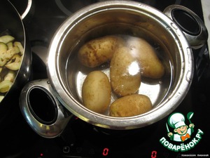 • Тем временем молодой картофель хорошо промываем, не удаляя кожи, отвариваем до полу готовности в соленой воде.