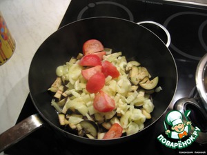 • Добавляем к смеси мелко рубленные томаты и баклажаны, растительное масло.