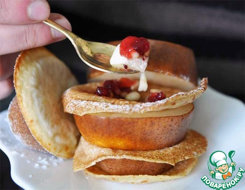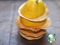Затем процедуру повторяем: блинчик, груша, сыр с клюквенным соусом и кедровыми орешками, блинчик и так далее. В конце кладём "макушку" от груши.