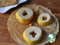Берём готовые блины, раскладываем на них кружки груш и вырезаем круги диаметром немного больше диаметра груш.