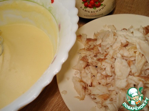 Рыбу отправляем в тесто и хорошо размешиваем. Кусочки отварной рыбы должны "раствориться" в тесте. Добавляем соду и размешиваем.