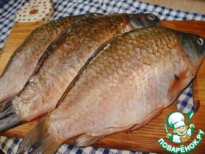 У меня были небольшие карасики, поэтому резать на порции я их не стала, оставила целыми. Чтобы избежать проблем с мелкими косточками карасей, начинаем делать поперечные насечки от хвоста к голове на спинке, прорезая рыбу до самого хребта.